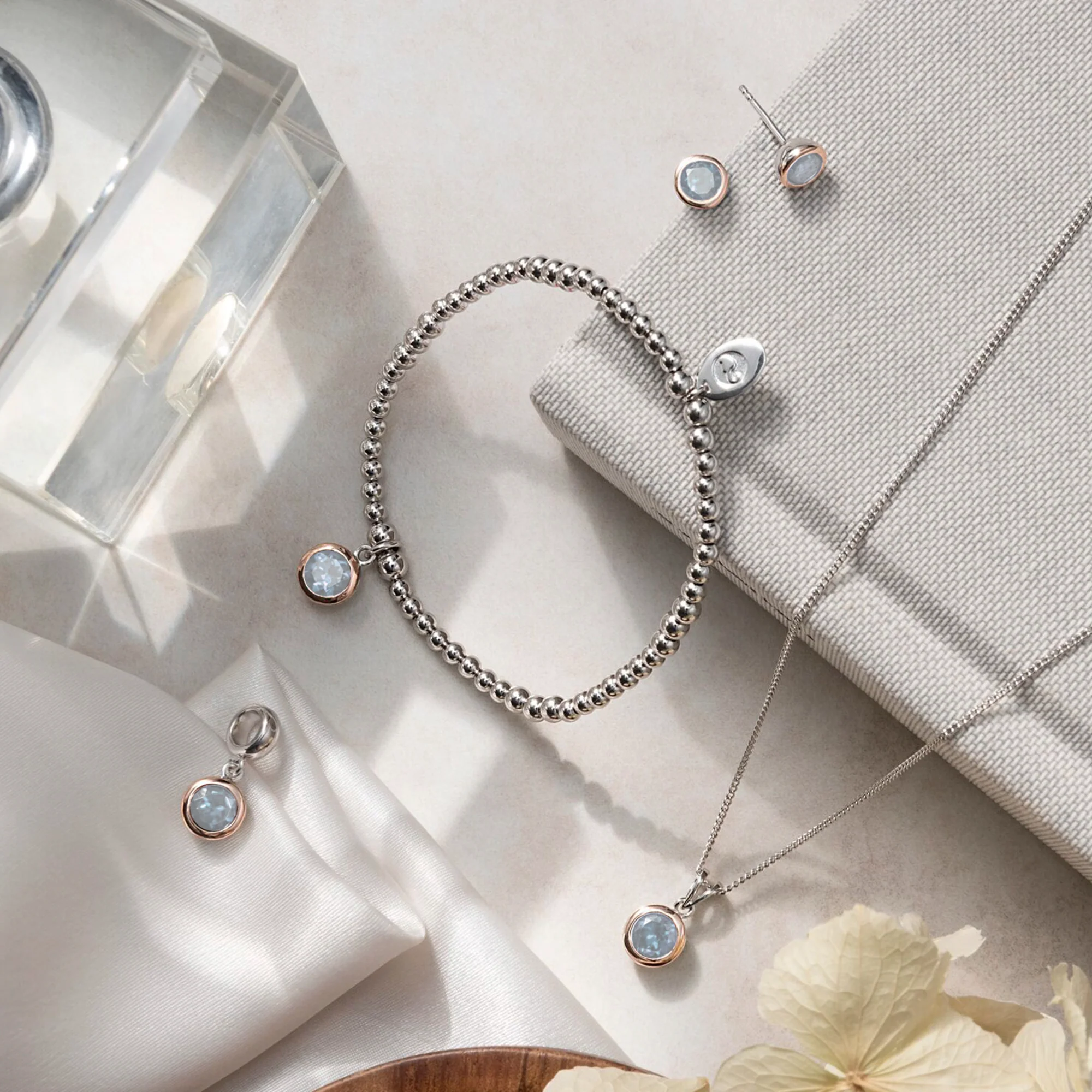 Celebrate a special December birthday with a beautiful blue topaz gemstone in a sterling silver setting adorned with 9ct rose gold. The colour of calm blue waters, this birthstone is said to promote harmony and relaxation - while imbuing its wearer with creativity.
